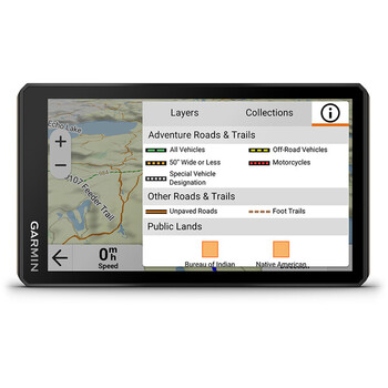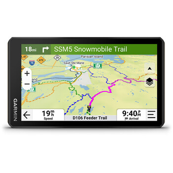 • Navigation sur pistes et virage-à-virage permettant d'explorer des routes non asphaltées, des sentiers et des pistes de motoneige avec les cartes Adventure Roads and Trails.